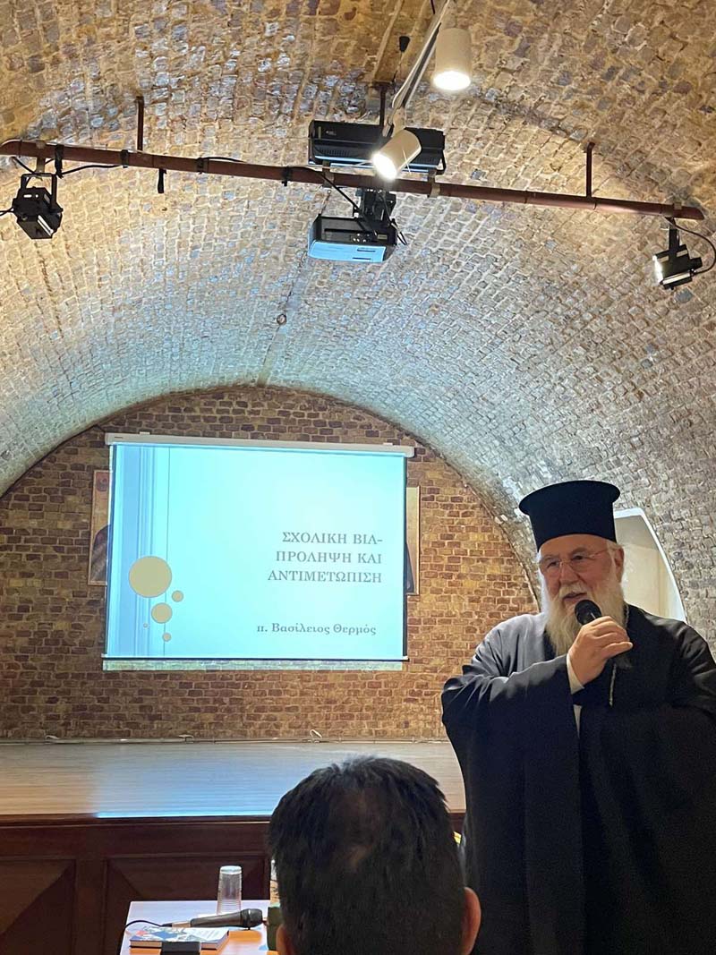 Ο π. Βασίλειος μίλησε με θέμα: “Σχολική βία: πρόληψη και αντιμετώπιση”. Σε μια πυκνή ομιλία αναφέρθηκε στους τρεις ομόκεντρους κύκλους που πρέπει να έχει υπόψιν του ο εκπαιδευτικός, ο οποίος ασχολείται σήμερα με τη σχολική βία: την παγκόσμια προοπτική, την ελληνική προοπτική, καθώς και την οικογενειακή κατάσταση του παιδιού και του εφήβου. Και στους τρεις κύκλους υπάρχουν στοιχεία που υποκινούν την βία, η οποία στην πραγματικότητα ενυπάρχει στον άνθρωπο, όχι όμως για να κυριαρχήσει, αλλά για να μετουσιωθεί σε δημιουργικότητα και υγιή διάθεση για πρόοδο. Πολιτισμός, αγωγή και θρησκευτικότητα είναι οι τρεις παράγοντες που μπορούν να συμβάλουν στην μετουσίωση της βίας.