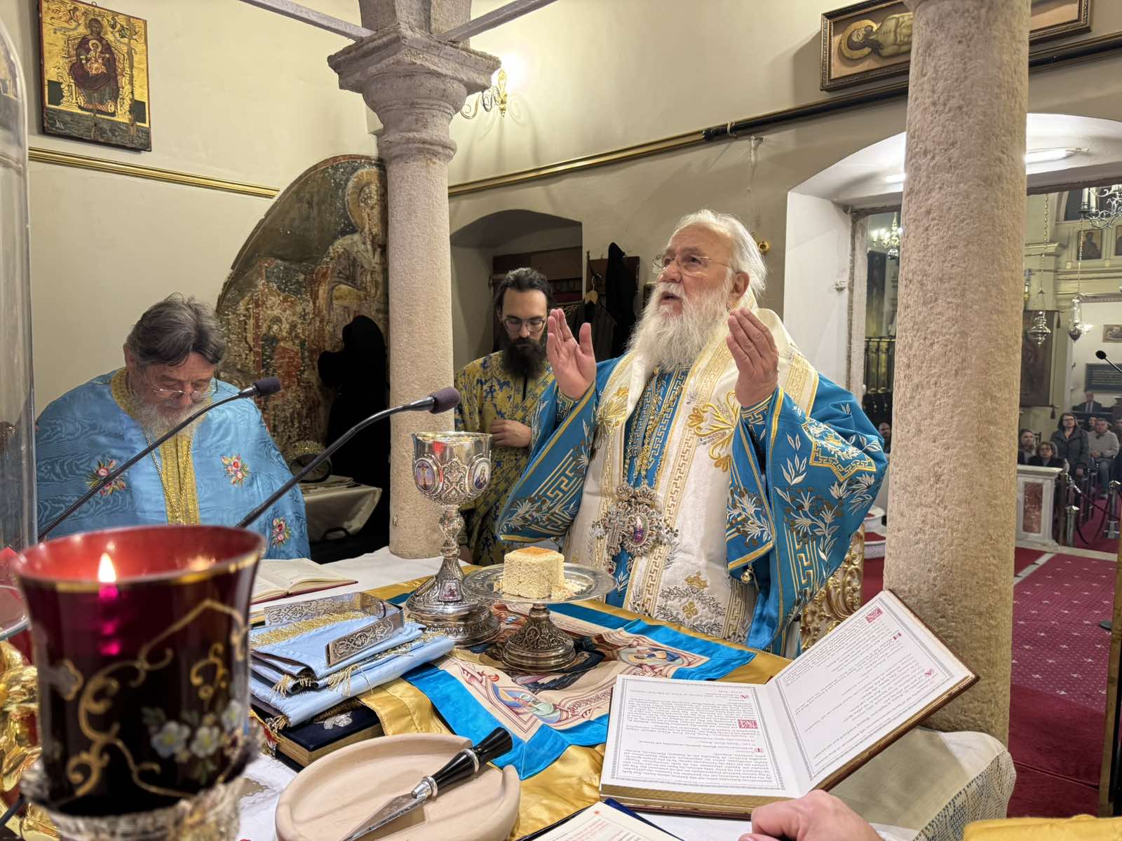Ο Σεβασμιώτατος, μετά το πέρας της Θείας Λειτουργίας, τέλεσε επιμνημόσυνη δέηση στον αείμνηστο προκάτοχό του κυρόν Πολύκαρπο Βαγενά όστις κατά αυτήν την ημέραν παρέδωσε τη μακαρία ψυχή του εις χείρας Θεού ζώντος. Επί τω τέλει, προέστη της Δοξολογία επί τη Εθνική Επετείω συμμετεχόντων των αρχών του τόπου μας και του λαού.