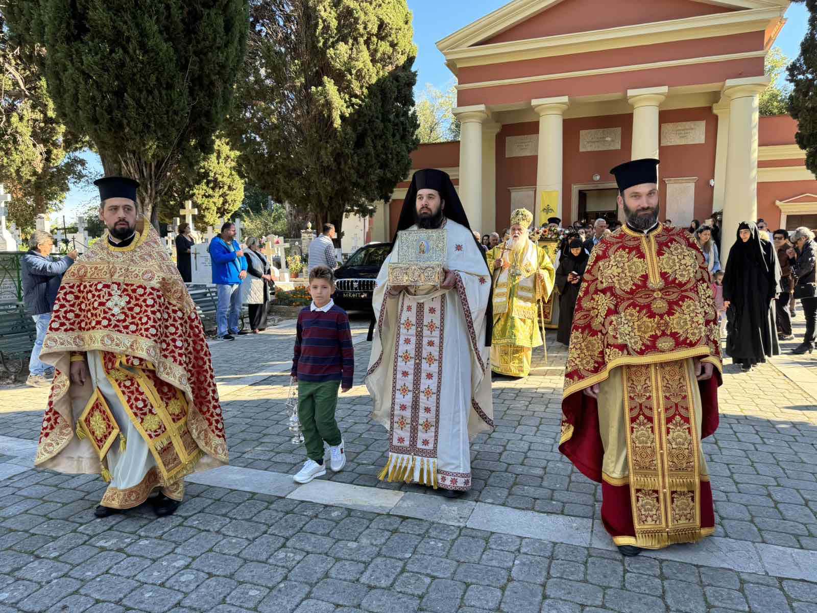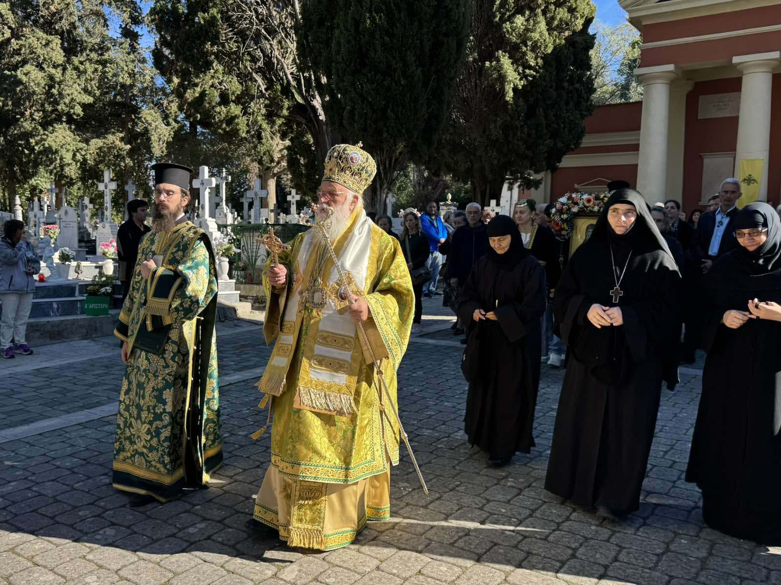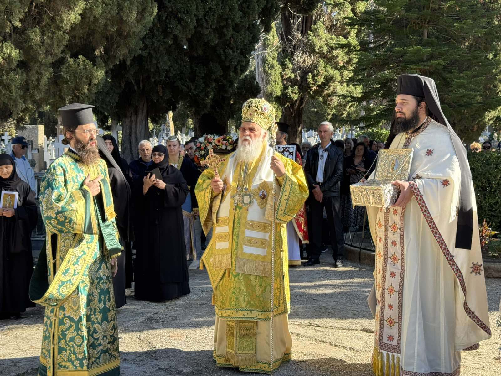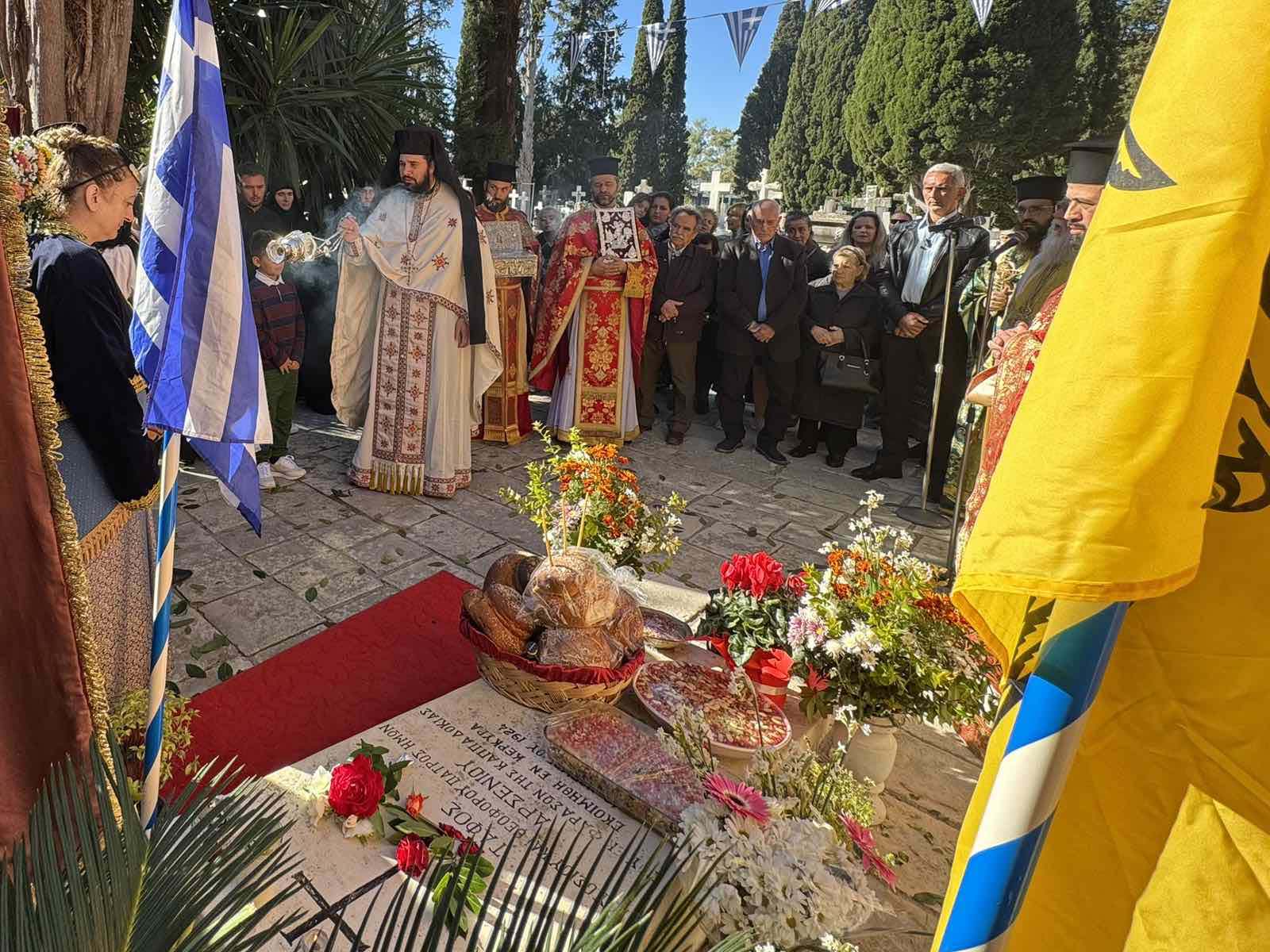 Στο τέλος της Θείας Λειτουργίας έλαβε χώρα και μικρά λιτανεία εντός του κοιμητηρίου. Ο Σεβ. ανέπεμψε δέηση υπέρ των κεκοιμημέμων οι οποίοι αναπαύονται από αιώνων. Εν τέλει, η λιτανεία έφθασε εις τον τάφο του Αγίου, ο οποίος είναι ευπρεπισμένος και επί του τάφου τελέστηκε η αρτοκλασία και ευλογήθηκαν τα σπερνά- κόλλυβα του Αγίου, ευχόμενος σε όλους να έχουμε τις πρεσβείες Του.