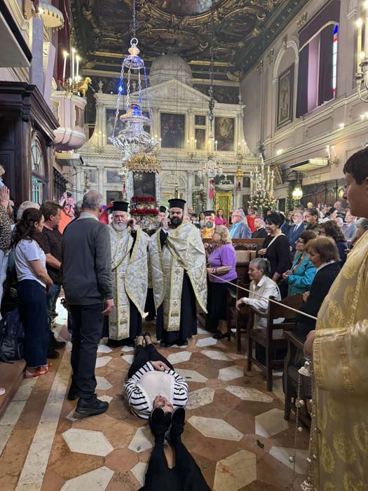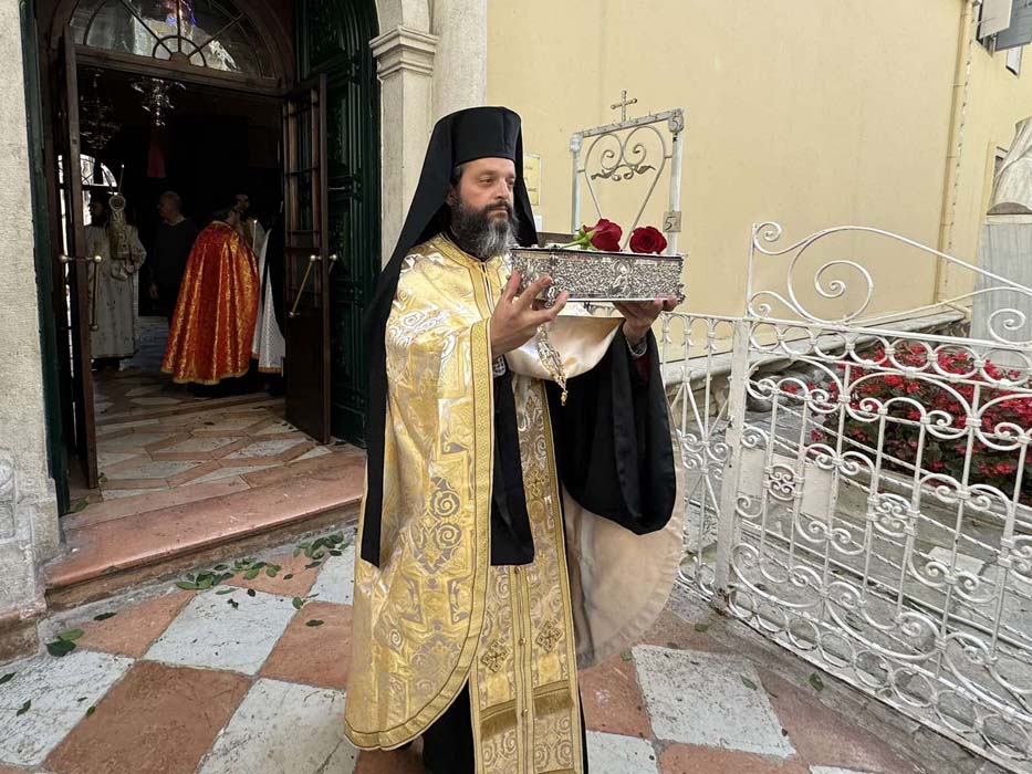 Προηγήθηκε η πανηγυρική ψαλμώδηση του «Χριστός Ανέστη» και στη συνήθη μελωδία, αλλά και κατά την κερκυραϊκή παράδοση, ενώ στην περιφορά προεξήρχε ο Θεοφιλέστατος Επίσκοπος Σταυροπηγίου κ. Αλέξιος, προσκεκλημένος του Σεβασμιωτάτου Μητροπολίτου Κερκύρας, Παξών και Διαποντίων Νήσων κ. Νεκταρίου. Κατά τα «μπάσματα» παιάνισαν προς τιμήν του Αγίου, κατά την κερκυραϊκή παράδοση, η Παλαιά Φιλαρμονική και η Φιλαρμονική ΜΑΝΤΖΑΡΟΣ, ενώ πλήθη κόσμου συμμετείχαν στην περιφορά τόσο εντός του ναού, όσο και στις θύρες, όπου κατά παράδοσιν βγαίνει το ιερό σκήνωμα και ευλογεί τον λαό, βασταζόμενο από τέσσερις κληρικούς, με την παρουσία και των αρχών του τόπου.