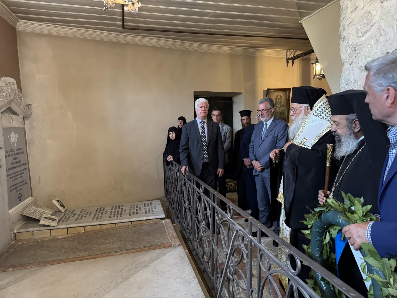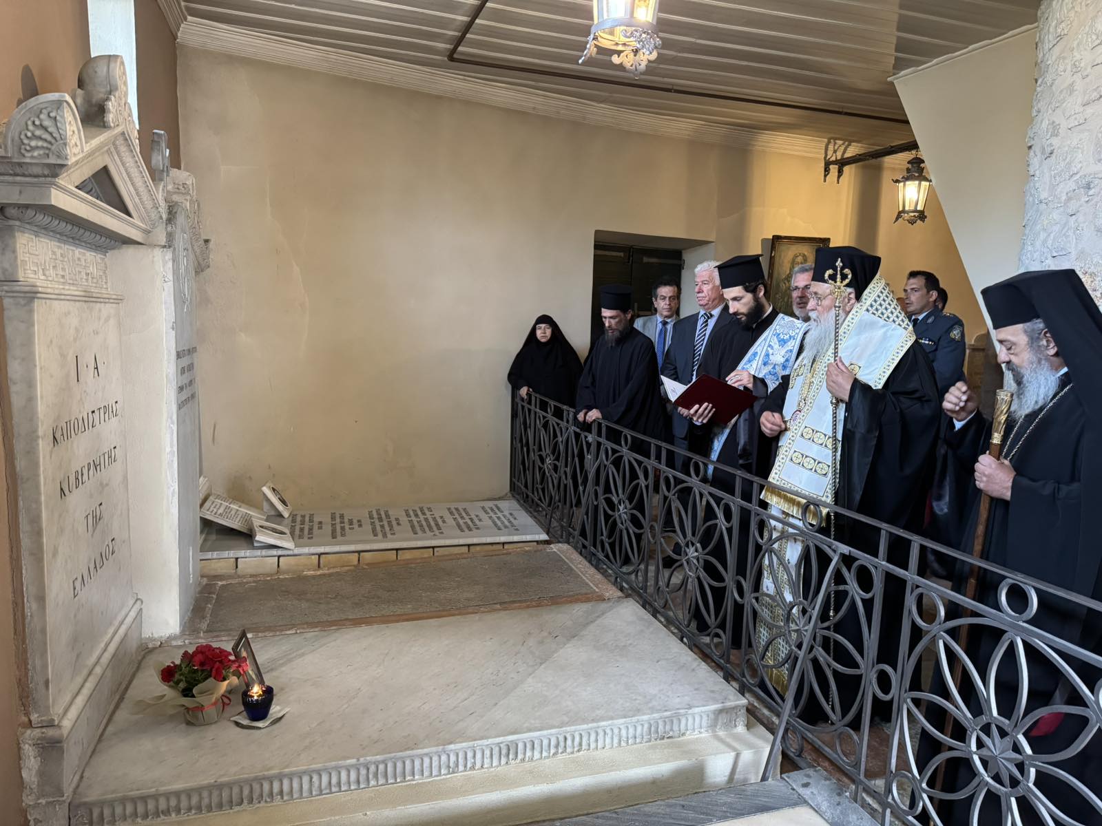 Ακολούθως, μετέβησαν στην Ιερά Μονή Πλατυτέρας, όπου βρίσκεται ο τάφος του αειμνήστου Ιωάννου Καποδίστρια, πρώτου κυβερνήτη της Ελλάδας. Μετά την τέλεση της επιμνημοσύνου δεήσεως επί του τάφου, κατέθεσαν στεφάνια ο Περιφερειάρχης Ιονίων Νήσων κ. Ιωάννης Τερπεκλης και ο Δήμαρχος Κεντρικής Κέρκυρας κ. Στέφανος Πουλημένος. Στο τέλος, εψάλη ο Εθνικός Ύμνος.