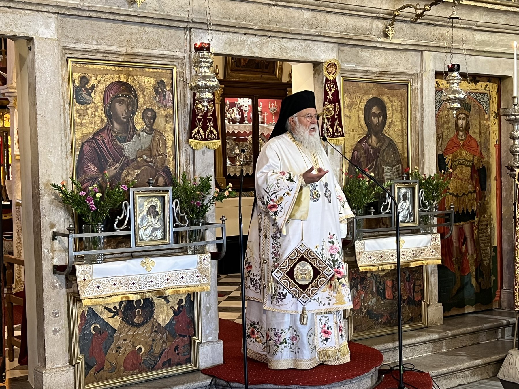 Ο Σεβασμιώτατος, απευθυνόμενος προς τους πιστούς κατά την ομιλία του, έλαβε αφορμή από την ευαγγελική περικοπή της εορτής. Αρχικά, αναφέρθηκε σύντομα στα περιγραφόμενα γεγονότα της περικοπής και συγκεκριμένα στην εορτή της σκηνοπηγίας που εορτάζουν οι Εβραίοι, στην οποία ενθυμούνται την περιπέτεια και τα δεινά που βίωσαν κατά τη διαδρομή τους προς την Γη τηςΕπαγγελία μέσα στην έρημο. Μία από τις δοκιμασίες που βίωσαν οι Εβραίοιήταν και αυτή της δίψας. Όμως, η πρόνοια του Θεού έδωσε λύση μέσα από το ύδωρ που ξεπήδησε από το βράχο που υπέδειξε ο Θεός να χτυπήσει ο Μωϋσής.Κατά την τελευταία ημέρα της εορτής της σκηνοπηγίας, που οι Εβραίοιπανηγύριζαν αυτό το γεγονός μέσα στο ναό του Σολομώντος, ο Ιησούς έκραξε«ὁ πιστεύων εἰς ἐμέ, καθὼς εἶπεν ἡ γραφή, ποταμοὶ ἐκ τῆς κοιλίας αὐτοῦῥεύσουσιν ὕδατος ζῶντος». Δηλαδή, εάν πιστεύετε σε μένα, δε θα διψάσετε ποτέ.