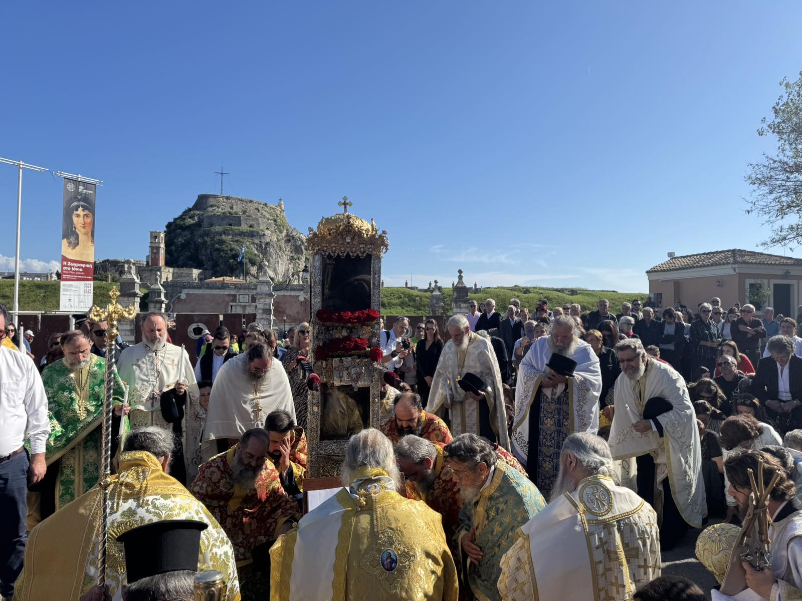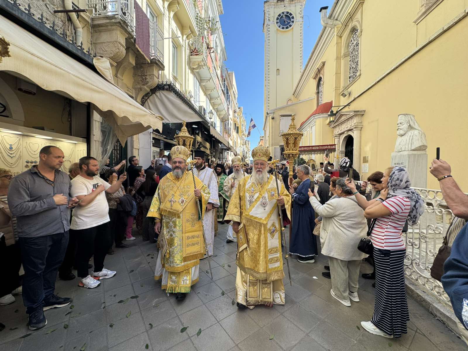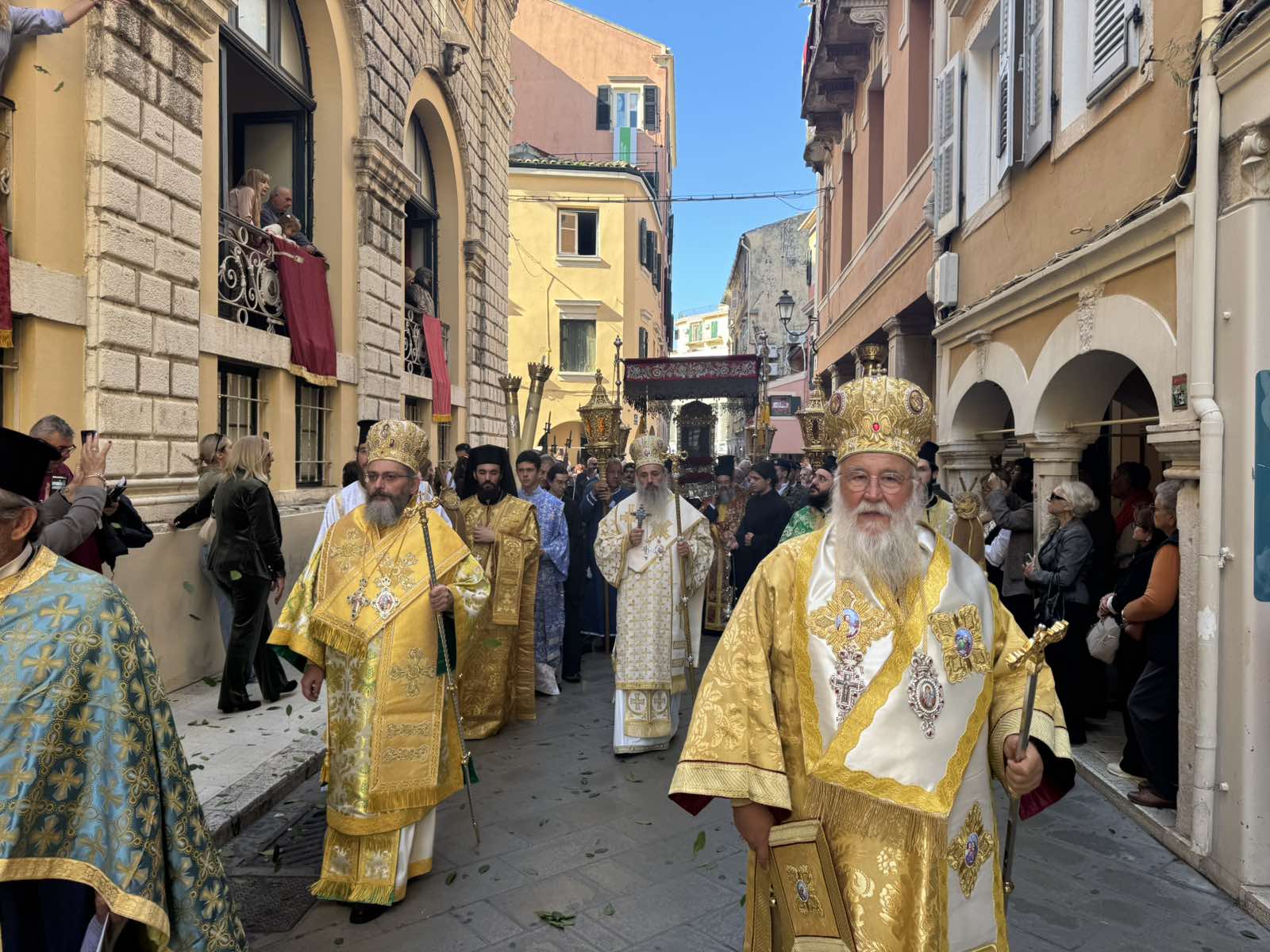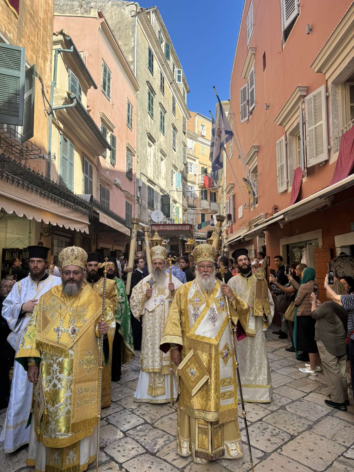 Στην είσοδο του Παλαιού Φρουρίου έγινε η καθιερωμένη γονυκλισία και ο Σεβασμιώτατος Μητροπολίτης Κερκύρας, Παξών και Διαποντίων Νήσων κ. Νεκτάριος διάβασε την προσευχή όλων στον Άγιο, ενώ στη συνέχεια, μπροστά από το ανάκτορο, έγινε η καθιερωμένη δέηση. Στη λιτανεία συμμετείχαν, προσκεκλημένοι του κ. Νεκταρίου, οι Σεβασμιώτατοι Μητροπολίτες Μπουκοβίνα και Μολδαβίας και Αρχιεπίσκοπος Ιασίου κ. Θεοφάνης, εκ της Εκκλησίας της Ρουμανίας, ο Σεβασμιώτατος Μητροπολίτης Ναζαρέτ κ. Κυριακός, εκ του Πατριαρχείου Ιεροσολύμων, ο οποίος έλκει την καταγωγή του από τα Χλωμοτιανά Κερκύρας, και ο Σεβασμιώτατος Μητροπολίτης Παραμυθίας, Φιλιατών, Πάργας και Γηρομερίου κ. Σεραπίων.