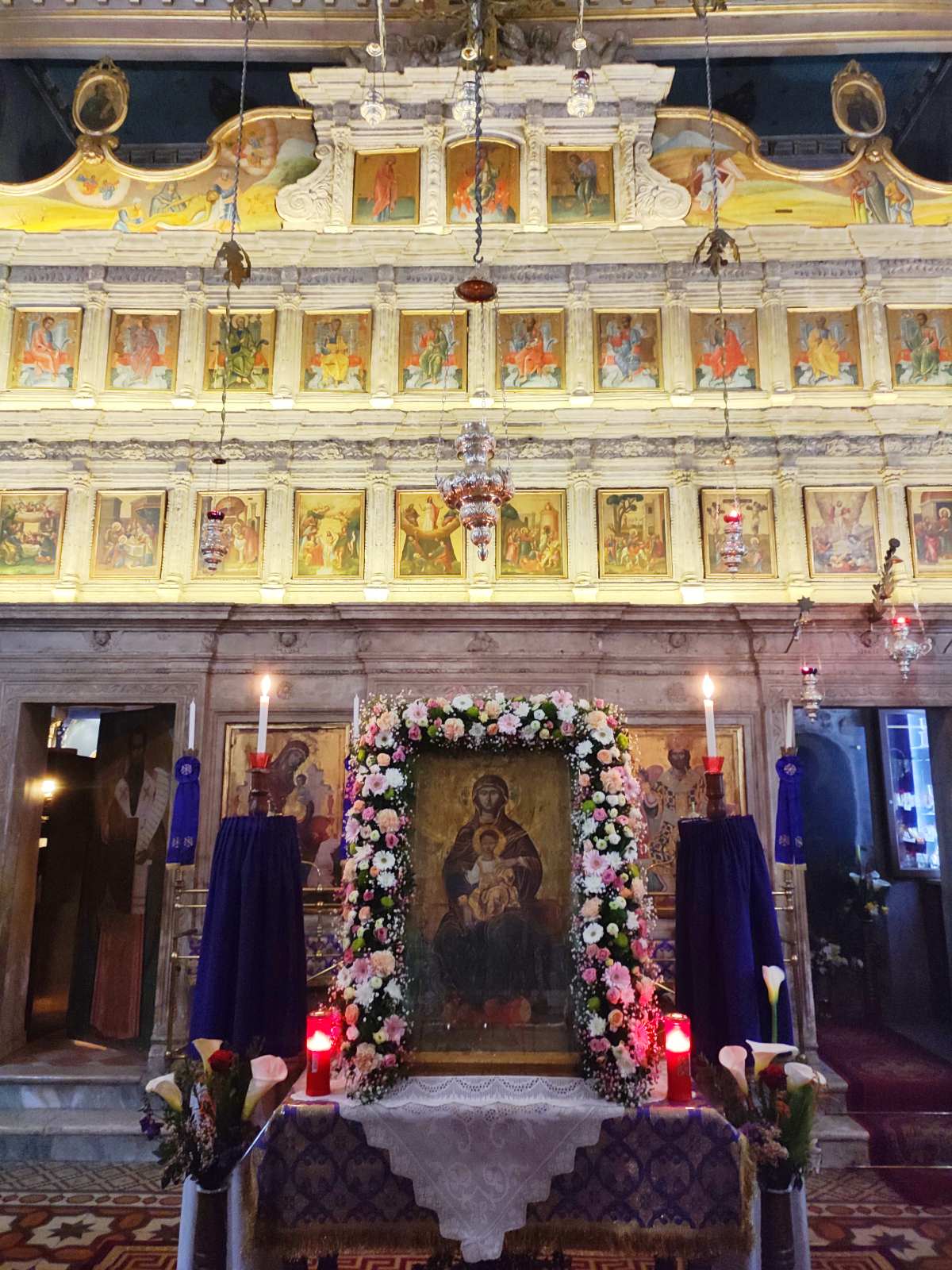 Αναφερόμενος στην πρώτη εικόνα, στάθηκε στον στίχο του Ακαθίστου Ύμνου, «Χαῖρε, πέτρα ἡ ποτίσασα τοὺς διψῶντας τὴν ζωήν». Ο Σεβασμιώτατος υπενθύμισε το γεγονός της πορείας των Ισραηλιτών στην έρημο, όταν ο λαός άρχισε να γογγύζει προς το Μωυσή εξαιτίας της δίψας. Τότε, με εντολή και αποκάλυψη του Θεού, ο Μωυσής χτύπησε με τη ράβδο του την πέτρα της ερήμου και από αυτήν «ἐρύησαν ποταμοί», δηλαδή ανέβλυσαν ποταμοί ύδατος, οι οποίοι ξεδίψασαν το λαό του Θεού κατά την πορεία του προς τη γη της Επαγγελίας. Οι Άγιοι Πατέρες της Εκκλησίας ερμηνεύουν την πέτρα αυτή ως προτύπωση της Παναγίας. Από τα σπλάχνα της ανέβλυσε για ολόκληρη την ανθρωπότητα το «ὕδωρ τῆς ζωῆς», δηλαδή ο ίδιος ο Κύριος ημών Ιησούς Χριστός, ο σαρκωμένος Λόγος του Θεού, ο Οποίος ήλθε στον κόσμο για να ξεδιψάσει πνευματικά τον άνθρωπο με το φως της αληθείας και τη χάρη Του. Εκείνος είναι «ὁ Ἄρτος τῆς ζωῆς», «ἡ Ὁδός», «ἡ Ἀλήθεια» και «ἡ Θύρα» της σωτηρίας. Από Εκείνον πηγάζει το ύδωρ της ζωής, το οποίο προσφέρεται σε κάθε άνθρωπο που αναζητεί την αληθινή ζωή και την πνευματική ελευθερία. Έτσι, η προτύπωση της πέτρας στην έρημο δεν αφορά μόνο την πρόσκαιρη ανακούφιση του λαού του Ισραήλ, αλλά φανερώνει βαθύτερα το μυστήριο της σωτηρίας, το οποίο πραγματοποιήθηκε διά της Θεοτόκου, μέσω της οποίας ο Λόγος του Θεού εισήλθε στην ανθρώπινη ιστορία για να ελευθερώσει τον άνθρωπο όχι απλώς από τη σωματική δυσκολία, αλλά κυρίως από τη δουλεία της αμαρτίας.
