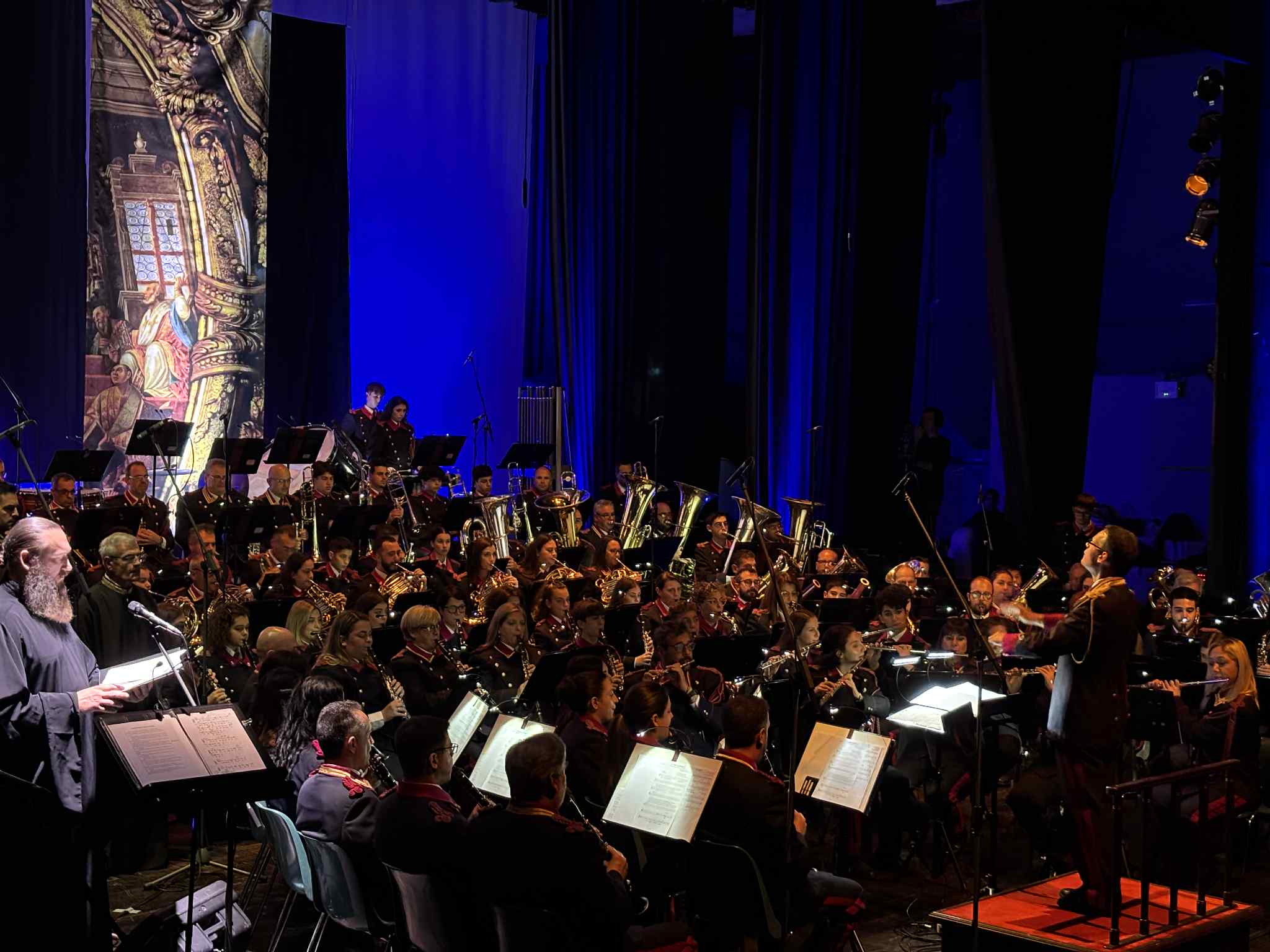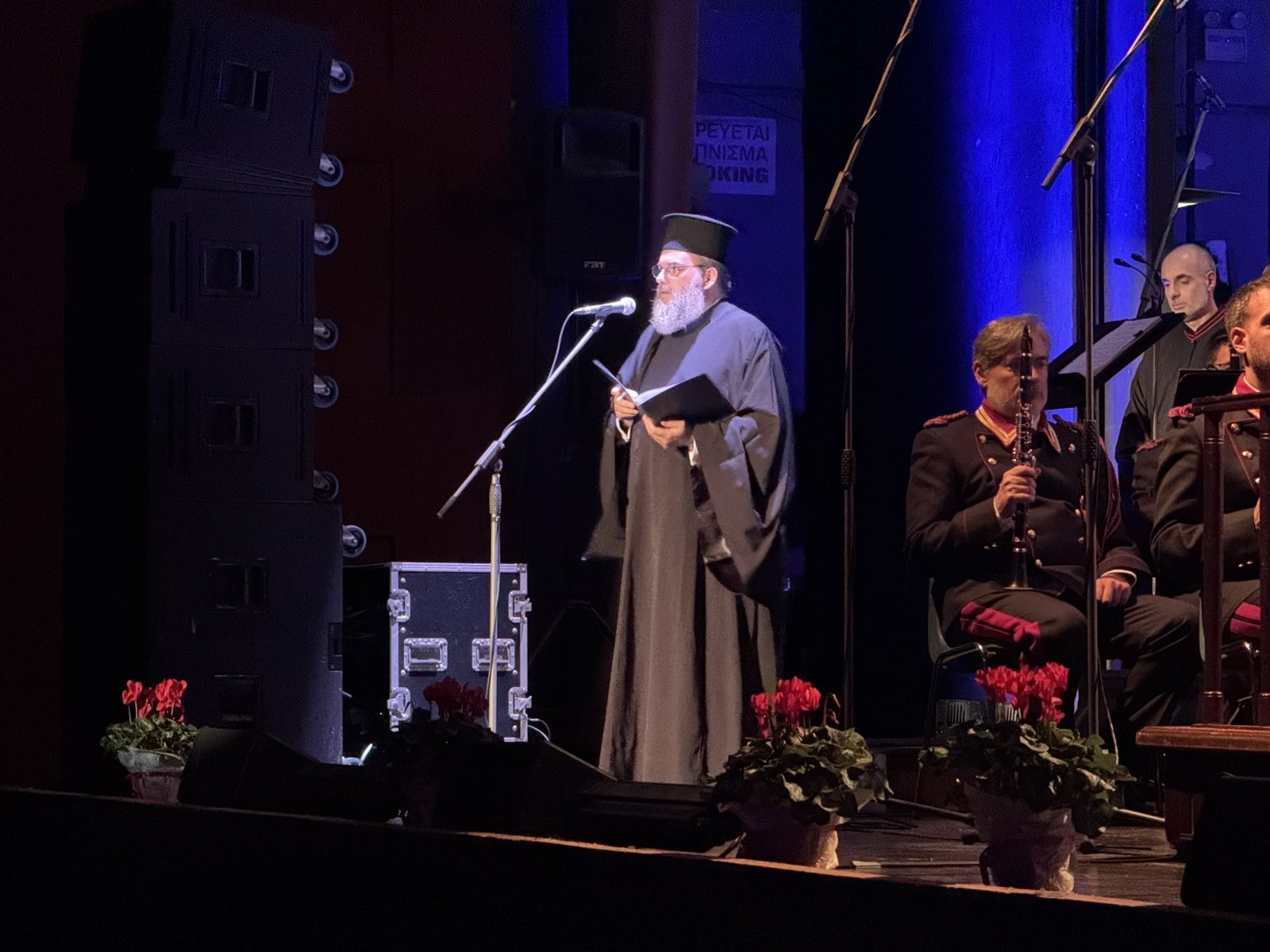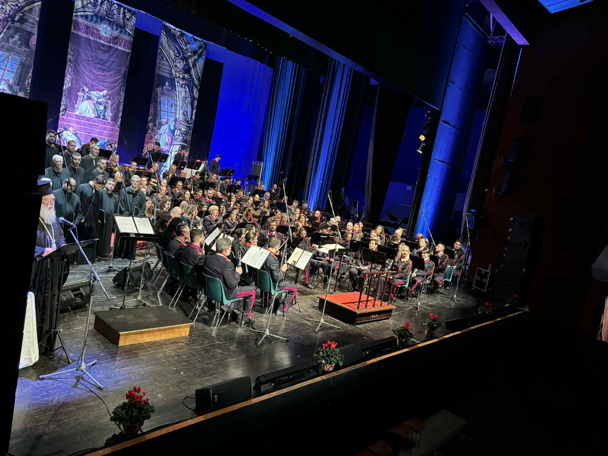 Μία ξεχωριστή συναυλία-λειτουργικό ορατόριο, με τη σύμπραξη της μπάντας της Παλαιάς Φιλαρμονικής Κερκύρας, υπό τη διεύθυνση του αρχιμουσικού Σπυρίδωνα Προσωπάρη, και της Χορωδίας της Σχολής Εκκλησιαστικής Μουσικής της Ιεράς Μητροπόλεως Κερκύρας «ΑΓΙΟΣ ΑΡΣΕΝΙΟΣ», υπό τη διεύθυνση του πρωτοψάλτη και χοράρχη Νικολάου Μακρόπουλου έζησαν το βράδυ του Σαββάτου 1ης Νοεμβρίου 2025 οι πολυπληθείς Κερκυραίοι που κατέκλυσαν το Δημοτικό Θέατρο Κέρκυρας. Το ορατόριο περιελάμβανε ύμνους από τη Θεία Λειτουργία, δοσμένους με μία εξαιρετικά πρωτότυπη αρμονική σύμπραξη των μουσικών παραδόσεων Δύσης και Ανατολής, ενώ η όλη εκδήλωση ήταν αφιερωμένη στα 1700 χρόνια από την Α’ Οικουμενική Σύνοδο και στο θαύμα του Πρωτοκύριακου στην Κέρκυρα, με τίτλο «Ο Άγιος Σπυρίδων στην παράδοση της Ορθοδοξίας και της Κέρκυρας». Κείμενα διάβασε ο ηθοποιός Σπύρος Βέργης, ενώ ξεχώρισε η εκπληκτική σύμπραξη στο Κοντάκιο του Αγίου Σπυρίδωνος και το ανέκδοτο μάθημα «Ύμνος στον Άγιο Σπυρίδωνα», σε υμνογραφική απόδοση του Κ. Θύμη, αλλά και η εξαιρετική μουσική σύνθεση του Σπύρου Κατσούρη «Ανεβαίνοντας στο καμπαναριό τ’ Αγιού».
