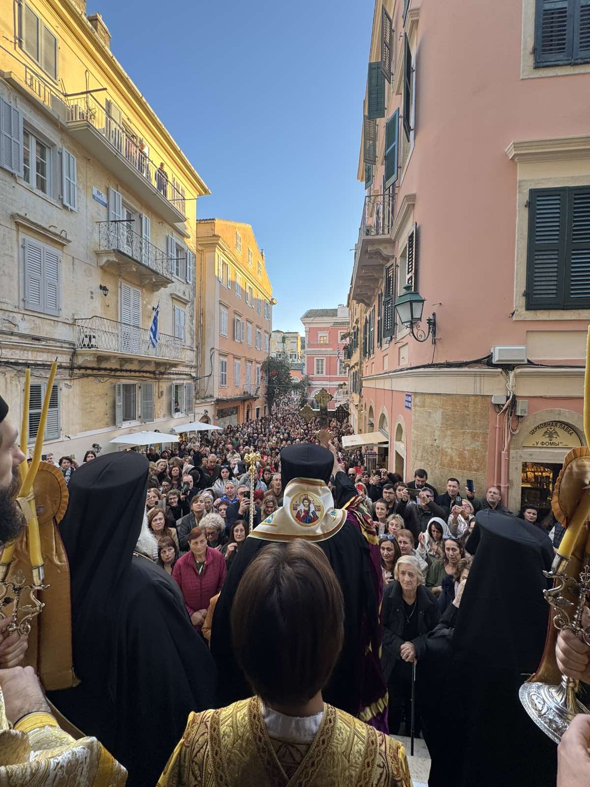 Ολοκληρώθηκαν οι λατρευτικές εκδηλώσεις για την μνήμη του προστάτου της Κέρκυρας Αγίου Σπυρίδωνος το απόγευμα του Σαββάτου 13 Δεκεμβρίου 2025 στο Ιερό Προσκύνημα με την Παράκληση στον Άγιο και τα «μπάσματα», δηλαδή την επανατοποθέτηση του ιερού λειψάνου στην λάρνακα. Της ακολουθίας προεξήρχε ο εκ του Οικουμενικού Πατριαρχείου Σεβασμιώτατος Μητροπολίτης Γέρων Πριγκηποννήσων κ. Δημήτριος, συλλιτανευόντων εντός του ιερού ναού των Σεβασμιωτάτων Μητροπολιτών Φιλαδελφείας κ. Μελίτωνος και Κερκύρας, Παξών και Διαποντίων Νήσων κ. Νεκταρίου. Παιάνισαν, κατά το κερκυραϊκό έθιμο, η Παλαιά Φιλαρμονική και η Φιλαρμονική ΜΑΝΤΖΑΡΟΣ.