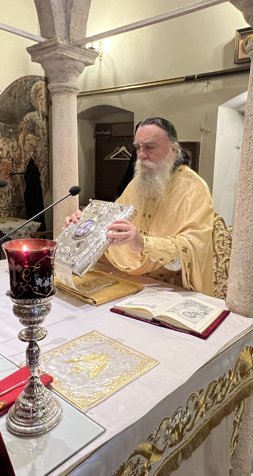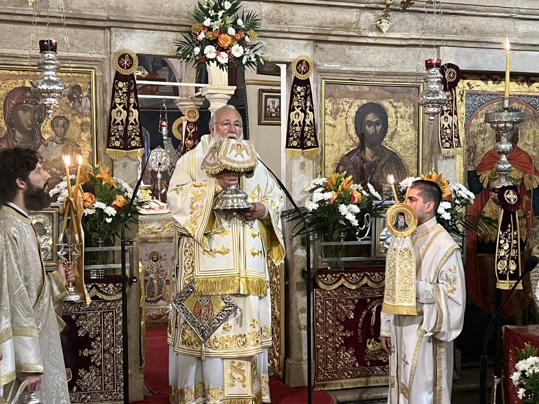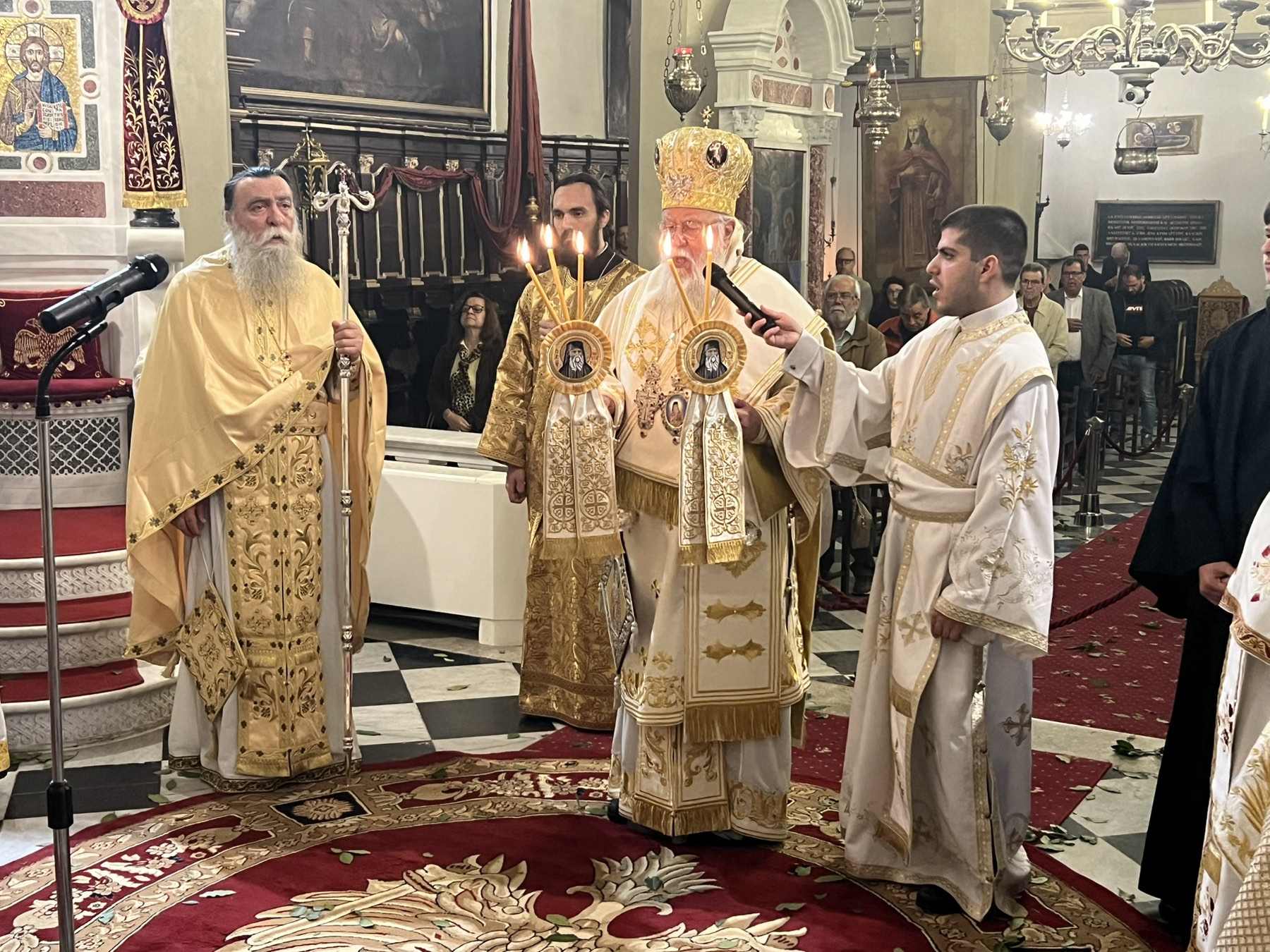 Στην θεία λειτουργία τον λόγο κήρυξε ο Αρχιμανδρίτης Χερουβείμ Βελέτζας, ιεροκήρυκας της Ιεράς Μητροπόλεως και Διευθυντής Προσωπικού της Ιεράς Συνόδου της Εκκλησίας της Ελλάδος, ο οποίος τόνισε ότι ο Άγιος Νεκτάριος κακολογήθηκε και διώχτηκε αδίκως από το Πατριαρχείο Αλεξανδρείας, αλλά και επέδειξε υπομονή και καρτερικότητα και στον περιφρονητικό τρόπο με τον οποίο του φέρθηκαν στον ελλαδικό χώρο. Ο άγιος άντεξε άντεξε διά της χάριτος του Θεού. Στηρίχτηκε στα χαρίσματα του Αγίου Πνεύματος. Επέδειξε πίστη, καρτερία, αγαθοσύνη, δεν κατέκρινε και με το παράδειγμα, αλλά και το συγγραφικό του τάλαντο, μας άφησε πολλές παρακαταθήκες. Έλαμψε το φως του έμπροσθεν των ανθρώπων, είδαν οι άνθρωποι τα καλά του έργα, δόξασαν τον Θεό Πατέρα, μας φώτισε και μας φωτίζει και γι’ αυτό πλήθη πιστών συρρέουν στο μοναστήρι του, για να προσκυνήσουν τον τάφο του και τα χαριτόβρυτα λείψανά του στην Αίγινα, για να ζητήσουν το φως που φώτισε τον ίδιο και τη χάρη του Θεού. Και επειδή τιμή Αγίου είναι η μίμηση Αγίου, ας προσπαθήσουμε να είναι και ο δικός μας βίος να είναι βίος σύμφωνος με τα χαρίσματα του Αγίου Πνεύματος, με ταπείνωση, μακροθυμία, υπομονή, αγάπη, χρηστότητα, ώστε να έχουμε χάρη. Τέλος, ευχήθηκε στον εορτάζοντα Ποιμενάρχη τα έτη πολλά και να ακολουθεί το παράδειγμα του Αγίου Νεκταρίου στη ζωή και στην ποιμαντορία του.